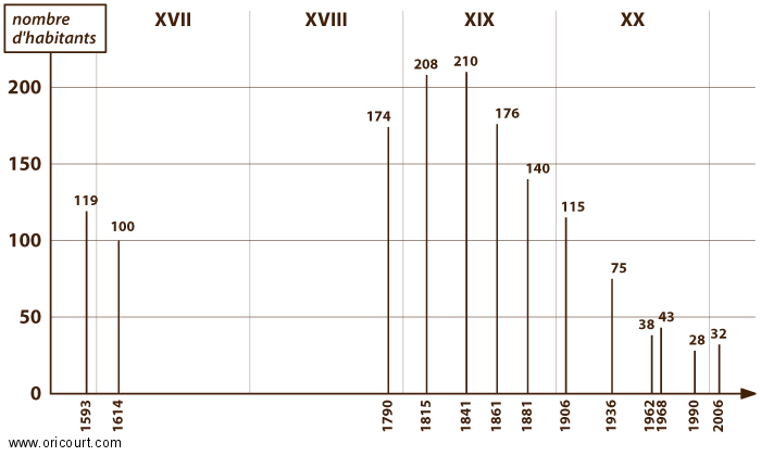 Comme dans de nombreux villages de la région, la population d’Oricourt atteint son maximum au recensement de 1841 avec 210 habitants.