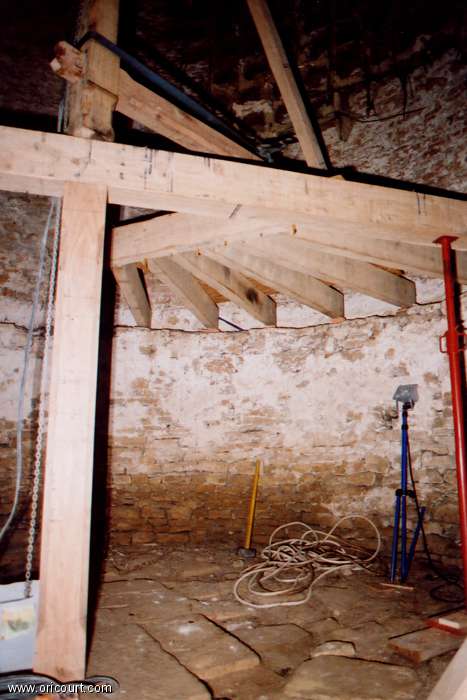 À l’intérieur, la charpente à double enrayure restaurée en 1984 et les nids en torchis. L’échelle tournante a été reconstruite au printemps 2007.