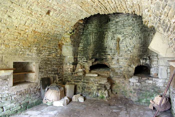 À l’ombre de la grande tour se situe la boulangerie dont les façades sont remaniées au XVIIIe siècle. Au rez-de-chaussée, au fond de la pièce voûtée, s’ouvrent deux fours, vraisemblablement du XVe siècle. La porte de chacun est protégée par un arc de décharge. À gauche, le plus vaste servait à la cuisson du pain. D’importantes fournées, espacées de plusieurs semaines, économisaient le bois. Le pain était alors rangé sur un rayonnage suspendu sous la voûte, à l’abri de l’humidité et des rongeurs. Entre ces périodes de chauffe, le four de droite, plus petit, était utilisé pour la pâtisserie ou la rôtisserie. En cas de siège, la population voisine venait se réfugier dans les murs et le fournil du château remplaçait le four banal édifié dans chaque village du fief.